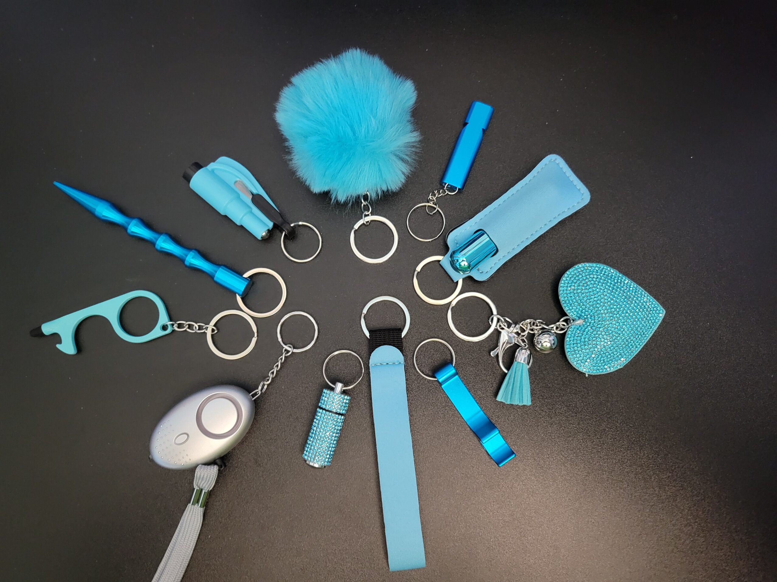 Diamond heart, can opener, wristlet, Diamond pill bottle, personal alarm/flashlight, door puller, kubaton, window breaker/seatbelt cutter, pom pom, whistle, perfume bottle and holder.