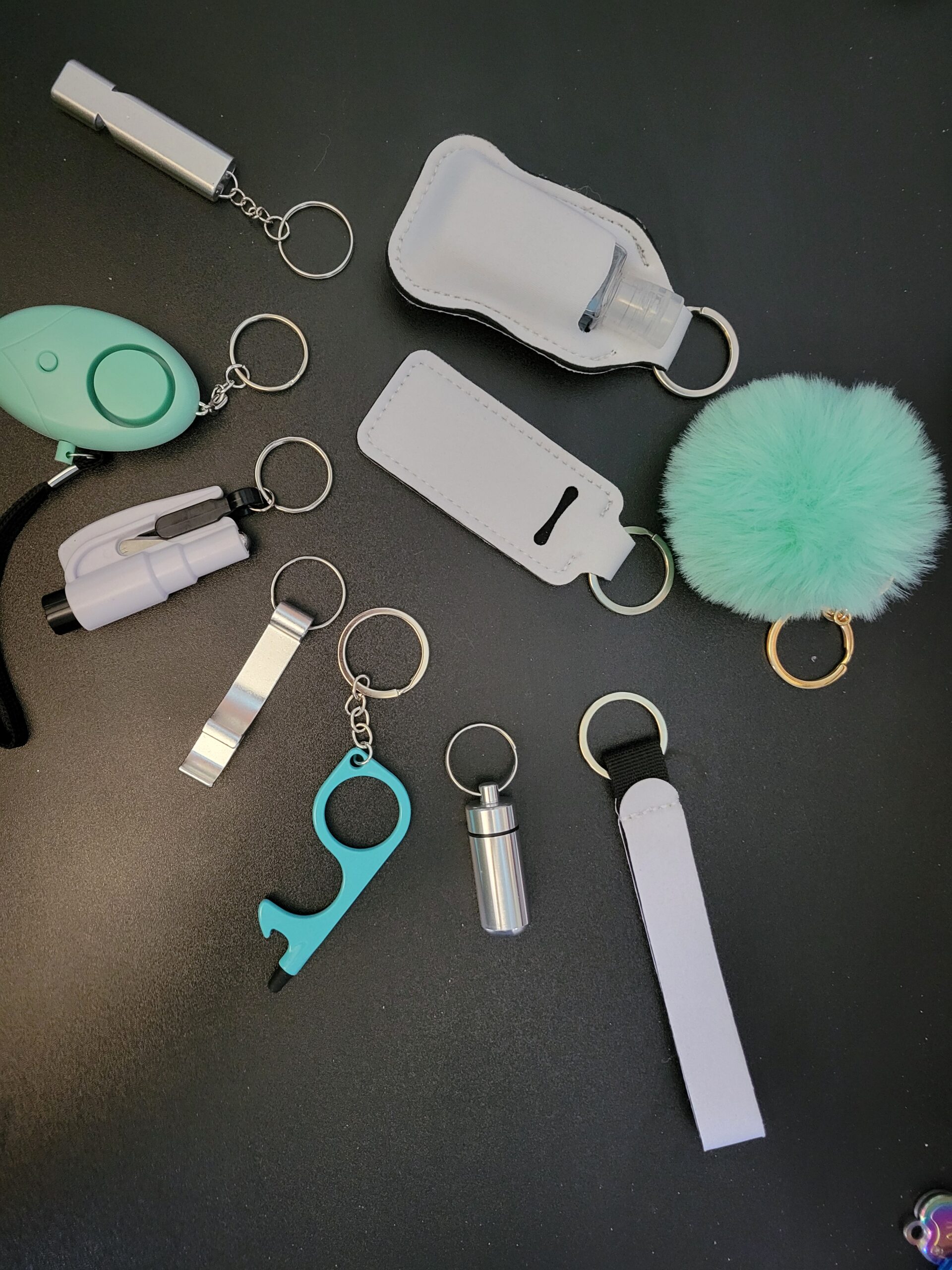 Pom pom, wristlet, pill bottle, door puller, can opener window/seatbelt cutter personal alarm/flashlight, sanitizer bottle with holder, and chapstick with holder