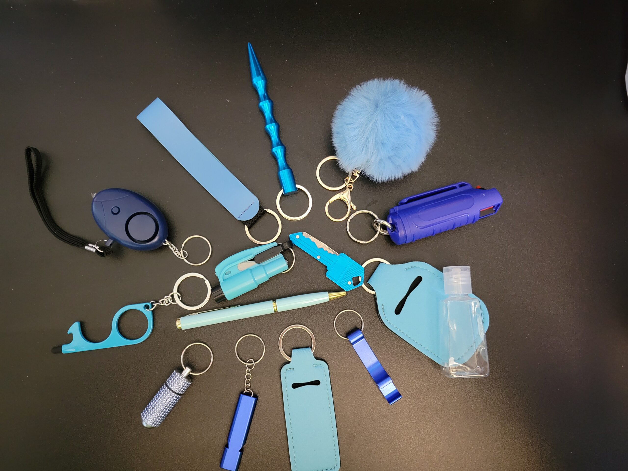 Pom pom, pepper spray, sanitizer and holder, can opener, chapstick and holder, whistle, diamond pill bottle, door puller, personal alarm/flashlight, wristlet, kubaton, key knife, window breaker/seatbelt cutter, inkpen knife