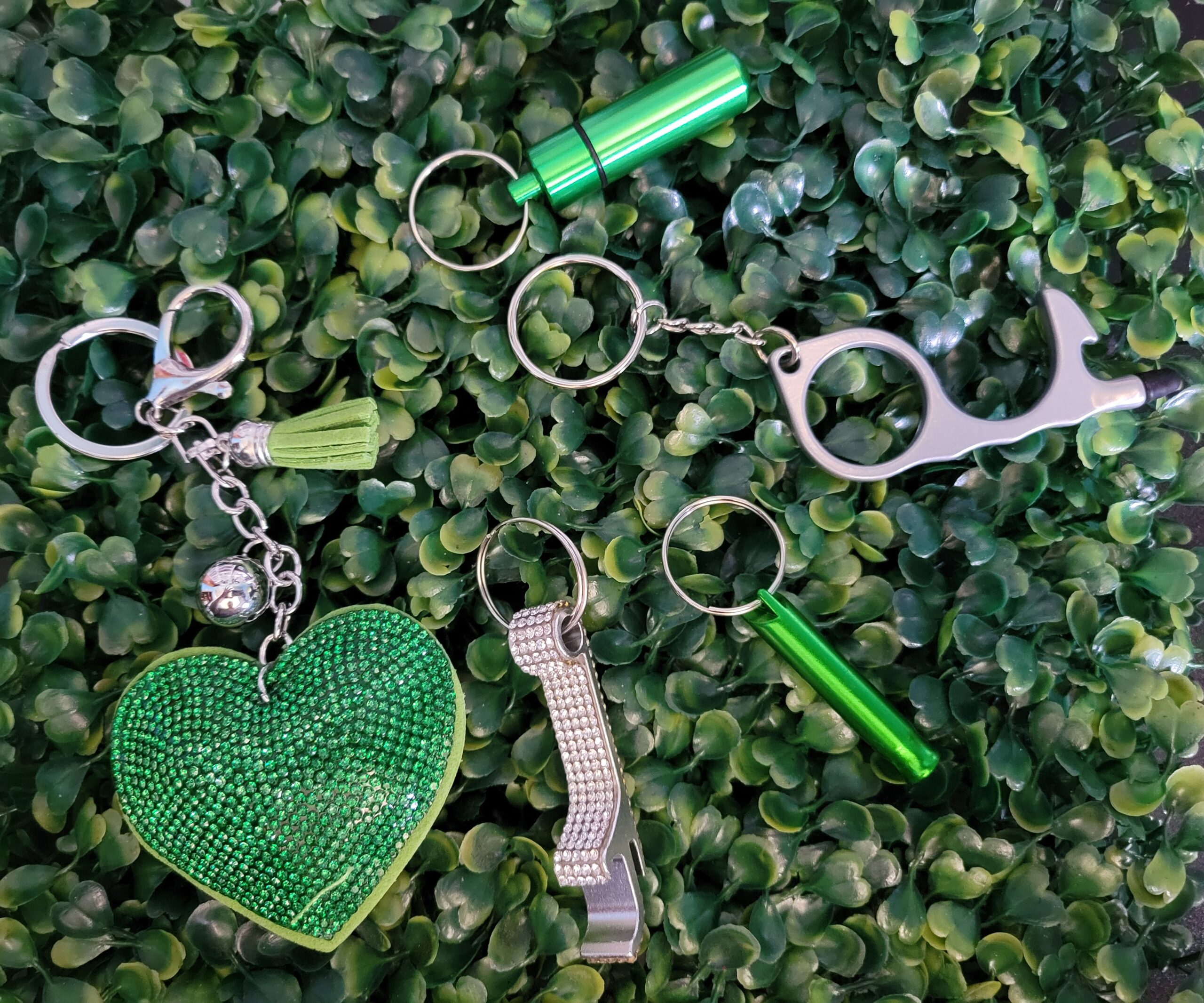 Diamond heart, small pill bottle, door puller, whistle, and can opener