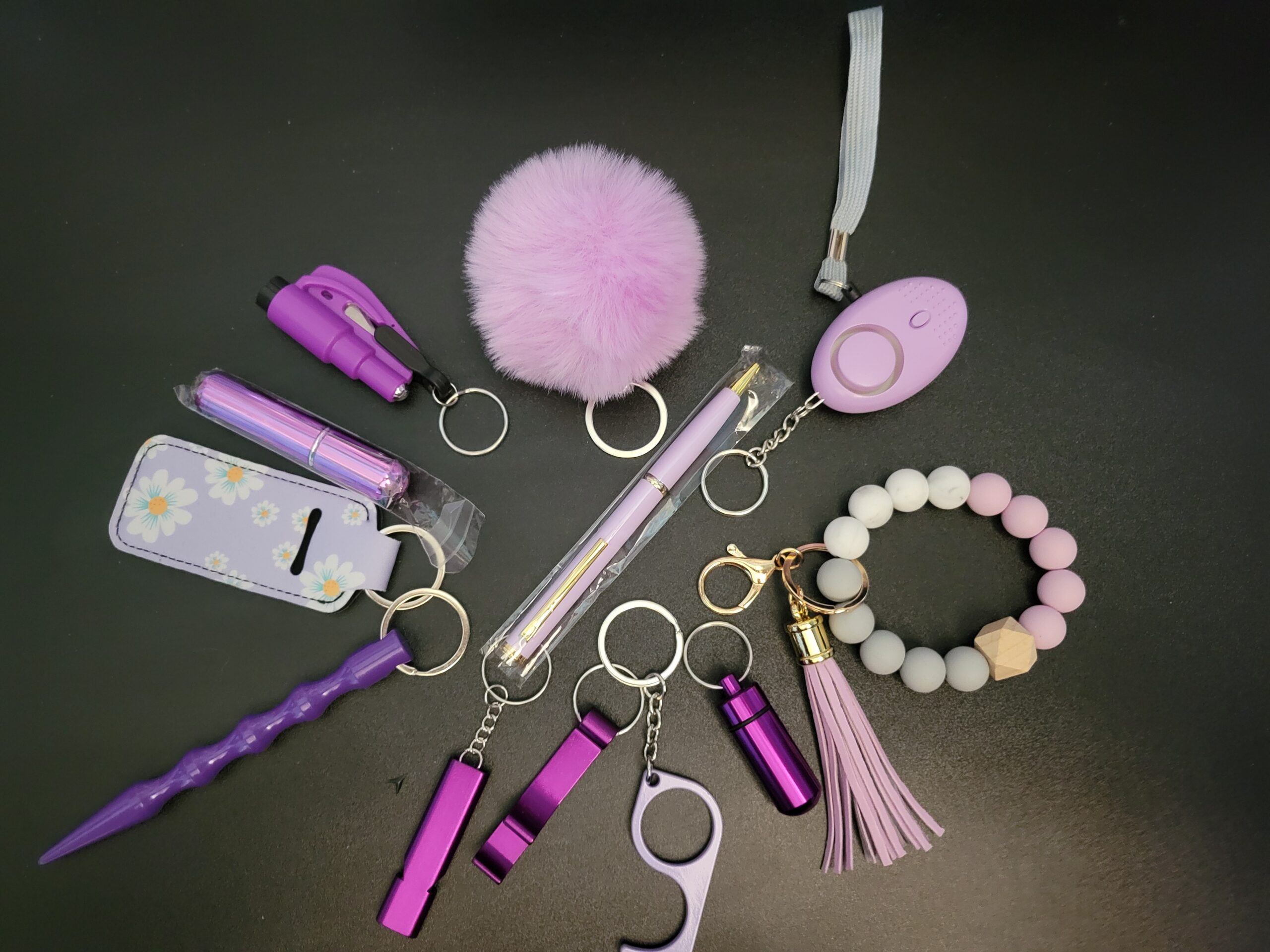 Beaded wristlet, pill bottle, door puller, can opener, bottle opener, whistle, kubaton, sanitizer/perfume and holder,window breaker/seatbelt cutter, pom pom and ink pen knife