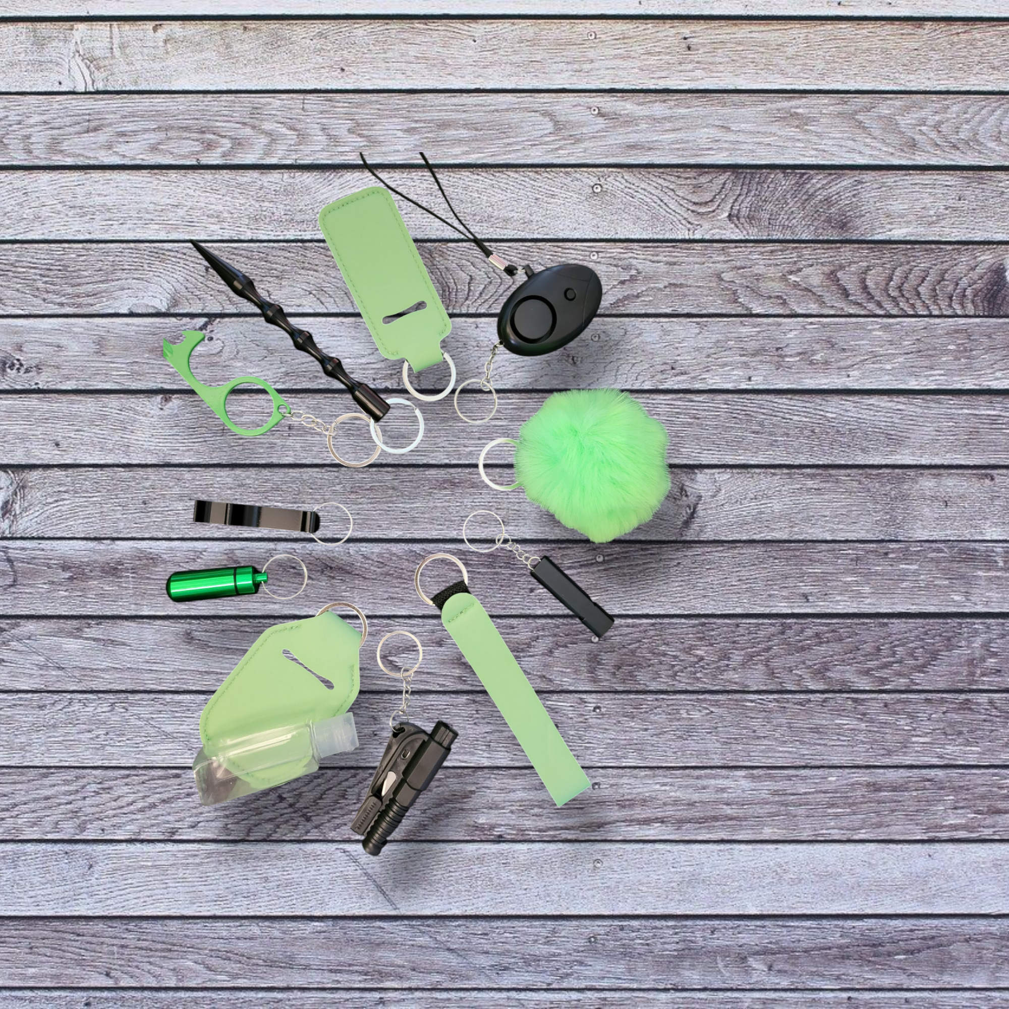 Pom pom, whistle, wristlet, window breaker/seatbelt cutter, sanitizer and holder, pill bottle, can opener, door puller, kubaton, chapstick and holder, personal alarm/flashlight