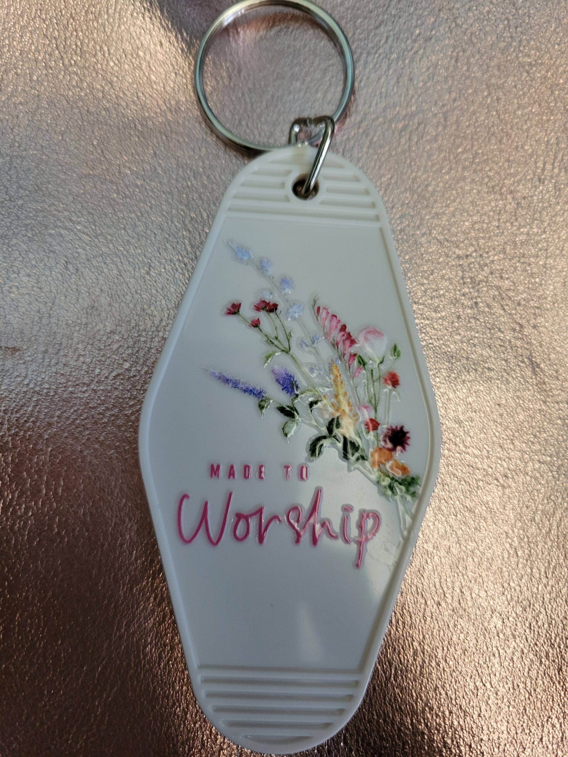 Plastic motel keychain, made to worship floral