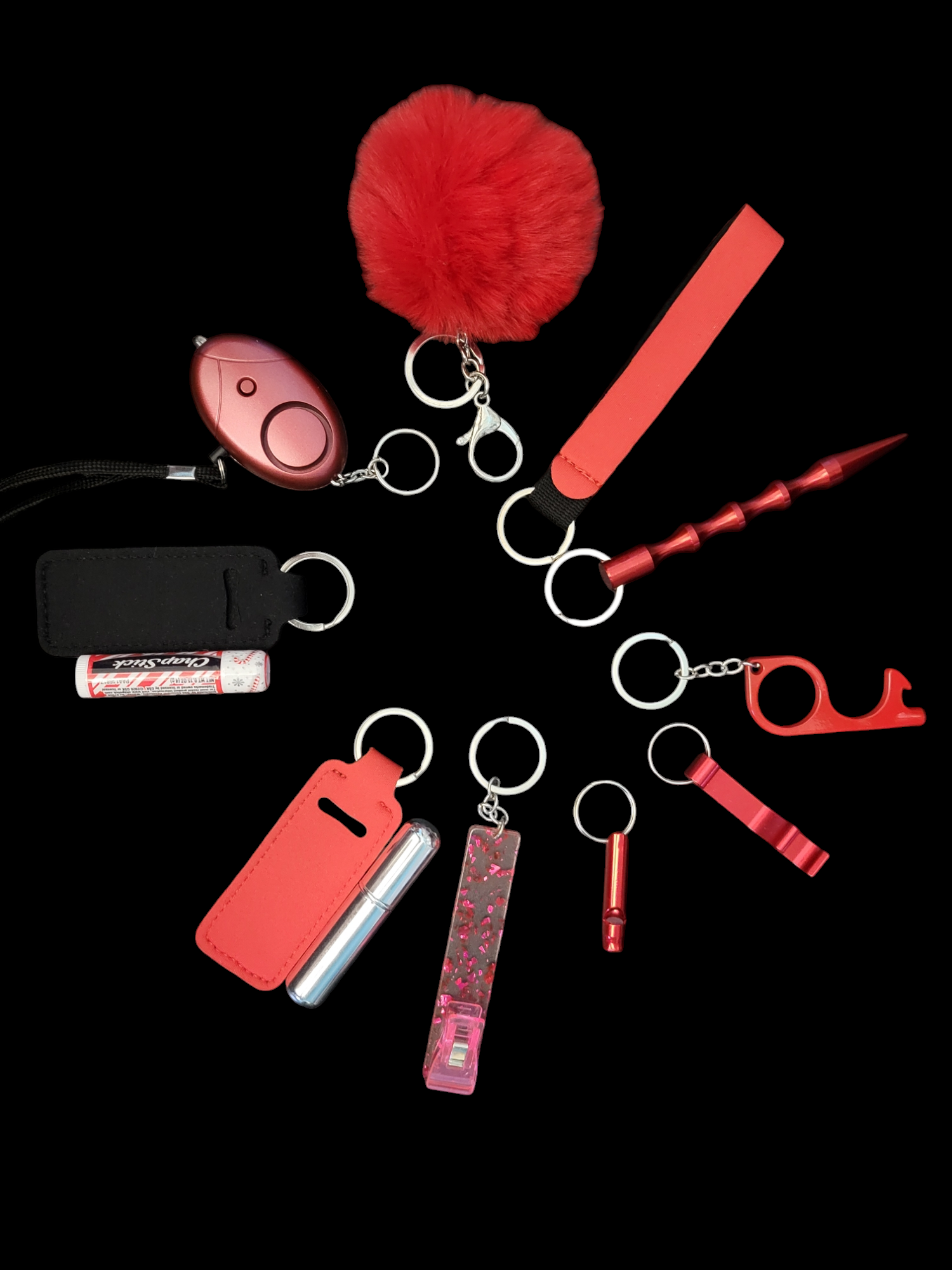 Pom pom, wristlet, window breaker, door puller, can opener, whistle, credit card grabber, perfume/sanitizer bottle and holder, chapstick and holder, and personal alarm/flashlight